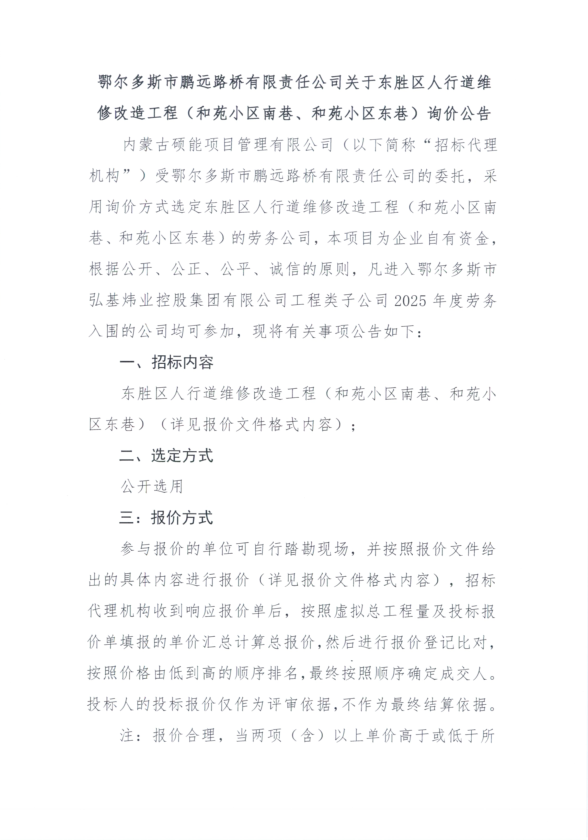 鄂尔多斯市鹏远路桥有限责任公司关于东胜区人行道维 修改造工程(和苑小区南巷、和苑小区东巷)询价公告