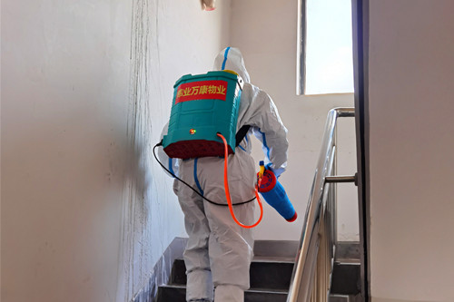 伴随着隆隆的轰鸣声,消毒水的气味扑面而来,“爱家行动”服务队开始了他们的工作,只见他们身着防护服,全方位武装,背着重达四、五十斤的消毒水箱,在服务区域开展全覆盖、无遗漏、按频次、零死角的消杀工作。